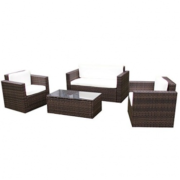 Diese Sitzgruppe aus Rattan ist in einem dunklen Braun gehalten. Im Lieferumfang sind zudem beigefarbene Kissen enthalten. Diese sind wasserabweisend und der Bezug kann abgezogen und gewaschen werden. Der Tisch ist mit einer Glasplatte versehen. Die Sitzgruppe ist UV-beständig und wetterfest. Sie ist sowohl für den Garten als auch die Terrasse ideal geeignet. Die Sitzgruppe lädt nicht nur zum Verweilen und gemütlichen Zusammensitzen ein, sondern ist auch ein toller Hingucker.