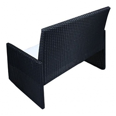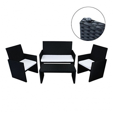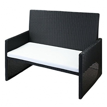 - sehr gutes Preis-Leistungs-Verhältnis, günstig in der Anschaffung, tolle Ausstattung für die Terrasse, bietet Platz für vier Personen dank einer Bank und zwei Sesseln, tolles Design in schwarzem Polyrattan