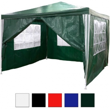 Der Gartenpavillon vom Maxstore wird in fünf Farben angeboten: rot, schwarz, weiß, blau und grün. Somit passt er sich jedem Farbgeschmack gut an. Der Pavillon hat eine Fläche von 9m² und eine Höhe von 2,6m. Damit ist gewährleistet, dass auch größere Personen bequem Platz darin finden. Da der Pavillon zusammen mit sämtlichen Heringen und einer Spannschnur geliefert wird, steht seinem zügigen Aufbau nichts im Wege.