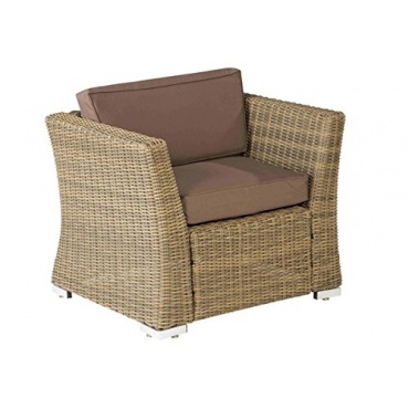 Der Gartensessel in Rattan-Optik von FW macht optisch auf jeden Fall etwas her. Das Geflecht des Sessels ist aus Kunststoff und in der Farbe Saharabeige gehalten. Die vier Füße des Sessels haben Beschichtungen aus Kunststoff. Im Lieferumfang enthalten sind ebenfalls ein passendes Rücken- sowie ein Sitzkissen. Diese haben die Farbe Taupe und passen sich so besonders gut an den restlichen Sessel an.