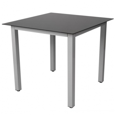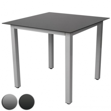 Gartentisch 80x80 cm in hellgrau/schwarz mit einer Sicherheitsglasplatte, wobei der Rahmen des Gartentisches aus Aluminium besteht. Der Gartentisch bietet eine große Fläche und eine leichte Pflege und ist überall einsetzbar. Der Gartentisch umliefert das Gestell, die Sicherheitsplatte beziehungsweise das Sicherheitsglas und eine Aufbauanleitung in drei Sprachen.