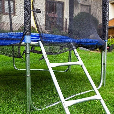 - Sehr stabiles bis zu 160 Kilogramm belastbares Trampolin, inklusive Sicherheitsnetz, Leiter und Wetterschutz, sehr gut für das Aufstellen im Außenbereich geeignet.