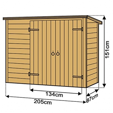 Der Geräteschuppen besteht aus wetterbeständigem Nadelholz und wird außerdem mit einem Regalboden geliefert, auf dem zum Beispiel Töpfe, kleine Pflanzschaufeln oder Gartenscheren gelagert werden können. Die Tür hat die Maße 134 x 141 cm, wodurch ein Rasenmäher oder ein Fahrrad bequem in den Schuppen geschoben werden kann. Die Montage des seine Geräteschuppens ist durch den Käufer durchzuführen, diese ist jedoch einfach zu bewerkstelligen, da eine Elementbauweise vorliegt.
