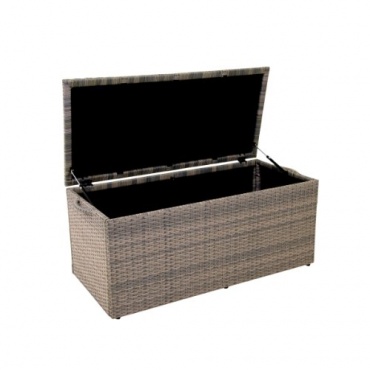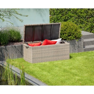 Die Kissenbox in Rattanoptik von Greenmotion bringt mit ihrem schlichten und doch modernen Design jede Menge Lounge-Feeling in den Garten oder auf die Terrasse. Die Box besteht aus wetterfestem und sehr robustem Polyrattan und bietet in ihrem Innern viel Stauraum für viele Kissen, Auflagen und Decken. So können diese nach einem Sonnenbad schnell und einfach in der Box verstaut werden und müssen nicht länger umständlich nach jedem Gebrauch in die Wohnung geschleppt werden. Bei einem Regenschauer sind die Kissen dank des wetterfesten Materials optimal geschützt.