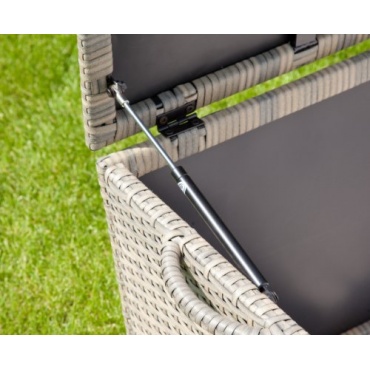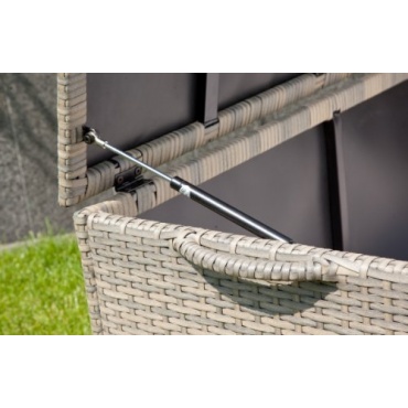 Die Kissenbox überzeugt aber nicht nur durch ihren Stauraum, sondern durch viele Details, mit denen sie ausgestattet ist. So befinden sich auf beiden Seiten der Rattankissenbox zwei Tragegriffe, mit der sie auch mal schnell an einen anderen Platz getragen werden kann. Zwei Gasdruckfedern unter dem Deckel erleichtern außerdem das Öffnen der Box.