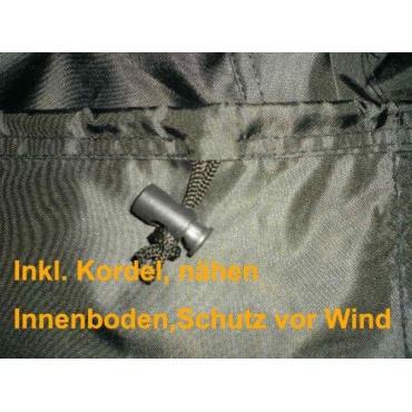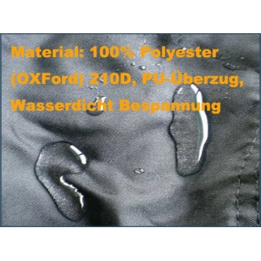 Aus 100 Prozent Polyester gefertigt ist die Abdeckhaube. Die Abdeckhaube ist mit einem PU-Überzug versehen, was die Abdeckhaube nicht nur Reissfest, sondern auch UV-beständig und wasserdicht macht. Zur Befestigung der Abdeckhaube ist diese mit doppelt genähten Säumen und einer Kordel ausgestattet. Die Abmessungen der Abdeckhaube betragen 170 x 61 x 117cm/145 x 61 x 117cm. Farblich ist die Abdeckhaube in einem schwarzen Farbton gehalten. Geliefert wird die Abdeckhaube in einer Tragetasche, die sich sowohl für den Transport als auch für die Aufbewahrung eignet.