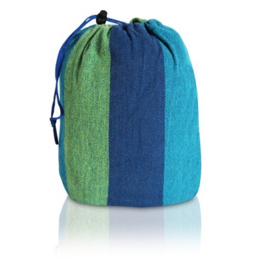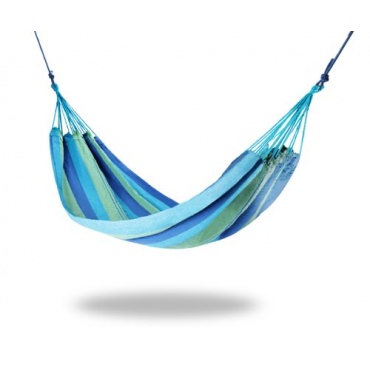 Aus einer Mischung von Baumwolle und Polyester, konkret aus 65 Prozent Baumwolle und 35 Prozent Polyester, besteht die Hängematte. Die Hängematte hat eine Liegefläche von 200 x 80 cm. Aufgrund der Abmessungen und der geringen Belastbarkeit von lediglich 120 kg, eignet sich die Hängematte nur für eine Person. Die Hängematte hat ein Gewicht von 862 Gramm, farblich ist sie in einem blau/ grünen Design. Mit seinen 862 Gramm ist die Hängematte sehr leicht im Gewicht. Geliefert wird die Hängematte mit einer Aufbewahrungstasche.