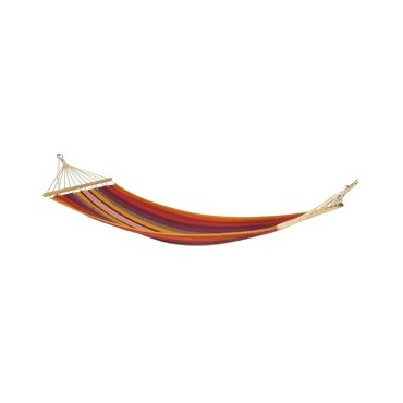 Die Hängematte bietet bequem einer Person Platz. Sie ist bis zu 150 kg tragfähig. Die Liegefläche beträgt 80 x 200 cm. Die Verarbeitung aus Baumwolle ist widerstandsfähig und reißfest. Über zwei Spreizstäbe wird das Belastungsgewicht materialschonend verteilt. Darüber hinaus halten sie dauerhaft die Liegefläche offen. Diese Stäbe bestehen aus Holz und besitzen einen Durchmesser von 3,2 cm bei einer Länge von 80 cm.