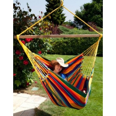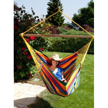 Die Liegefläche besteht aus mehrfarbigen Synthetikfasern, welche für eine bequeme Liegefläche sorgen. Das Material hält selbst Regen stand und trocknet rasch. Selbstverständlich ist der Hängesessel UV beständig und Feuchtigkeit spielt für diesen Hängesessel keine Rolle. Der moderne und exklusive Hängesessel überzeugt jedoch nicht nur mit seinem Design, auch das sehr gute Preis- und Leistungsverhältnis ist nicht zu vergessen. Am besten Sie überzeugen sich selbst und lehnen sich einfach entspannt zurück und verbringen einige unbeschwerte Stunden in dem Hängesessel.