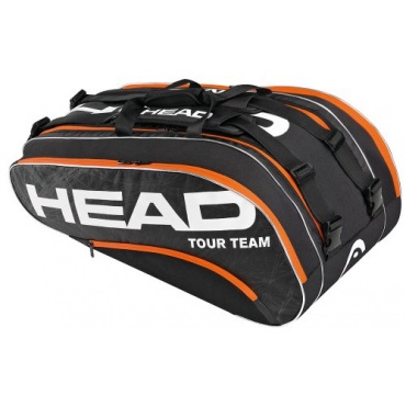 Die HEAD Tennisschläger Tasche Team Monstercombi in den Farben Schwarz-Orange ist eine trendige und funktionelle Schlägertasche, die Platz für 10 bis 12 Tennisschläger bietet. Ein Taschenfach verfügt über einen Thermoschutz, der den Schläger vor hohen Temperaturen schützt. Alternativ dazu bietet sich dieses Fach auch zum Kühlhalten von Snacks oder Getränken an. Im Innenbereich befindet sich eine Netztasche, die sich zum Verstauen von Kleinigkeiten anbietet. Hinzu kommt eine Außentasche mit Reißverschluss, in der weitere Utensilien untergebracht werden können.