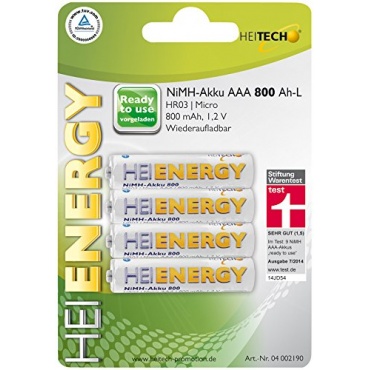 Für ein Elektrogerät nach einem passenden und leistungsfähigen Akku sucht, der sollte sich mal diesen Heitech NiMH-Akku HR03-Micro-AAA 800 mAh ansehen. Dieser Akku zeichnet sich durch eine gute Leistungsfähigkeit aus und ist auch im Rahmen einer Schnellladung von gerade mal 1.1 Stunden schnell wieder verfügbar. Die Handhabung vom Akku fällt leicht, was man auch den nachfolgenden technischen Informationen entnehmen kann.