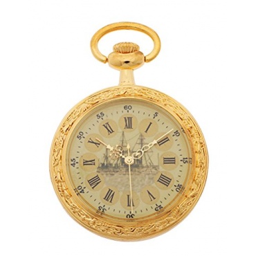 Mit einem Gewicht von nur 41 Gramm kann die goldfarbene Taschenuhr aus Metall leicht in der Tasche getragen werden und für einen besonderen Effekt auch zusätzlich mit einer Kette ausgestattet werden. Die klassische Uhr verfügt über ein modernes Quarz Werk, das Stunden, Minuten und Sekunden genau anzeigt. Das Zifferblatt der Uhr ist mit großen römischen Zahlen ausgestattet, die man leicht erkennen kann. In der Mitte der Uhr trägt ein Schiffsmotiv weiterhin zum ungewöhnlichen Charakter dieses Schmuckstückes bei.
