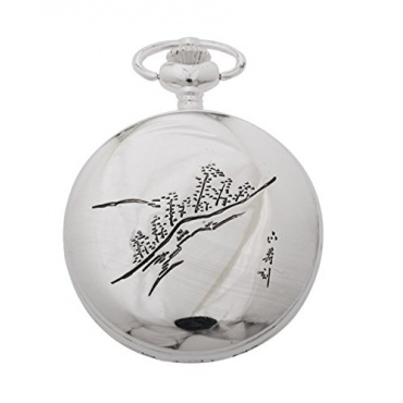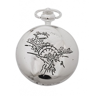Bei dem Produkt handelt es sich um eine silberne Taschenuhr. Auf dem Gehäuse sind zwei schwarze Gravuren, je eine auf der Vorder- und Rückseite, die Naturbilder zeigen. Das Gehäuse ist rund und kann aufgeklappt werden, um den Blick auf das weiße Ziffernblatt zu gewähren. Das Produkt hat eine Wasserdichte von 3 Bar, einen Durchmesser von 4,2 cm und eine Höhe von 0,9 cm.