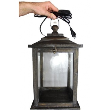 Die große Laterne ist aus massivem Vollholz in Handarbeit gefertigt und verfügt über seitliche Echtglas-Scheiben. Für ein einfaches Dekorieren, das Reinigen oder einen Birnenwechsel ist die Laterne mittels eines Metallhakens nach oben hin aufklappbar. Ein Leuchtmittel ist bereits fest integriert, angeschlossen an ein Kabel mit Handschalter und Stecker für den Betrieb mit 220 V. Eine stabile Öse ermöglicht die Aufhängung der Holzlaterne.