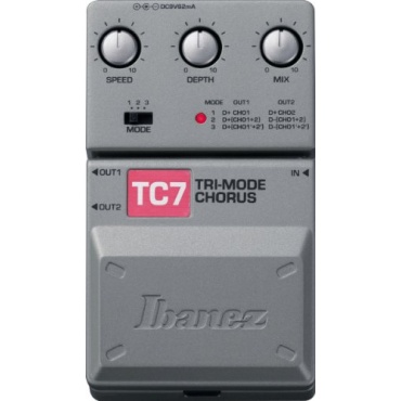 Das Ibanez TC7 Trimode Chorus Effektpedal ist Pre-Amp (Vorverstärker) und Effektgerät und ermöglicht das Erzeugen von 3 verschiedenen Chorus-Modi. Das Gerät hat einen Signaleingang und zwei Ausgänge. Es kann damit für einen Stereo-Setup benutzt werden, muss dafür jedoch den Anfang der Stereokette bilden. Über drei versenkbare Stellknöpfe lassen sich Speed (Chorussignal-Oszillationsgeschwindigkeit), Depth (Tiefe der Tonhöhenschwankungen) und Mix (Verhältnis von Originalsignal zum Effektsound) einstellen.