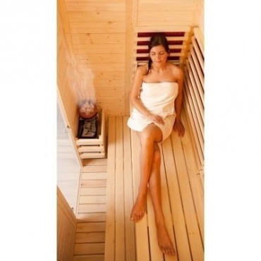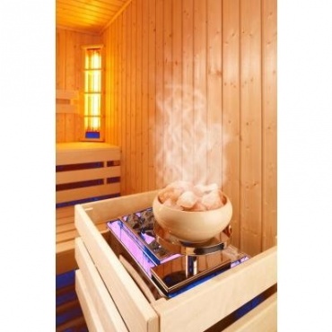 Die Rückenlehnen und die Zwischenbankverkleidung sind auch dem Weichholz in Linde hergestellt. In dem umfassenden Lieferumfang enthalten, sind ein Ofenschutzgitter und ein Fußrost. Besonders vorteilhaft ist auch der Eckblendschirm mit einer Saunalampe, die mit einer Saunacontrol C1 Steuerung bedient wird. Der Verdampferofen Bi-O-mini mit 3 kW ist ebenfalls enthalten, zu dem der Salzverdampfer Sole Therme Pur gehört und die passenden Silikonkabel.