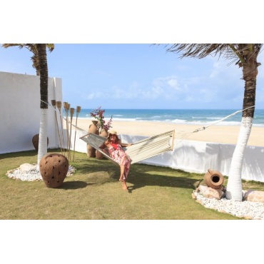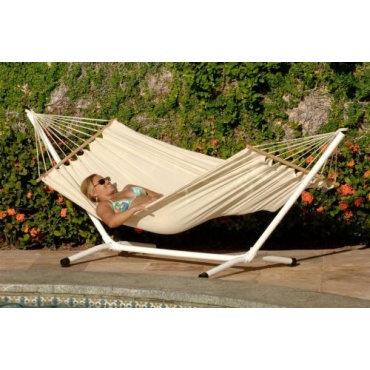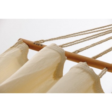 Die Hängematte macht durch ihre beige Aufmachung Lust auf Sommer, Sonne und Strand. Sie stammt aus brasilianischer Fabrikation. Sie gehört zur Kategorie "Fruit & Cocktail CLASSIC". Damit zeichnet sie sich durch Querstäbe aus. Diese verteilen das Gewicht und halten die Liegefläche dauerhaft offen. Darüber hinaus punktet das Produkt auch im Aspekt Qualität. Der TÜV Rheinland hat es zertifiziert.