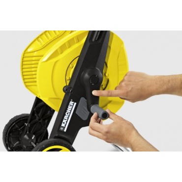 Die Ausstattung mit mehreren Schlauchkupplungen ermöglicht das Anstecken eines langen Schlauches um Distanzen zu überwinden, sowie eines kurzen Schlauches um die erreichte Stelle zu beregnen. Der Steckprozess kann auch umgedreht werden: Der kurze Schlauch wird am Wasserhahn angesteckt, der lange Schlauch aus der Trommel gezogen. Das Schlauchwagen Kit ist mit einem G3/4-Hahnanschluss und einem G1/2 Reduzierstück ausgestattet. Der Metallsteg am unteren Ende ist als Abrollrahmen einsetzbar und ermöglicht ein bequemes Abrollen des Schlauches bei Bewegung. Neben dem mitgelieferten ½" Schlauch kann auch ein 5/8"-Schlauch oder ¾"-Schlauch verwendet werden.