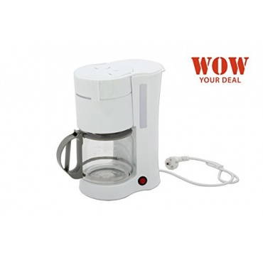 Die weiß-graue Kaffeemaschine WOW bereitet zwölf Tassen Kaffee zu. Die Maschine kann mit 1x4 grossen Filtern verwendet werden. Diese Maschine hat Tausend Watt. Das Gehäuse ist aus Kunststoff gefertigt und die Kanne aus Glas mit einem grauen Kunststoffdeckel.