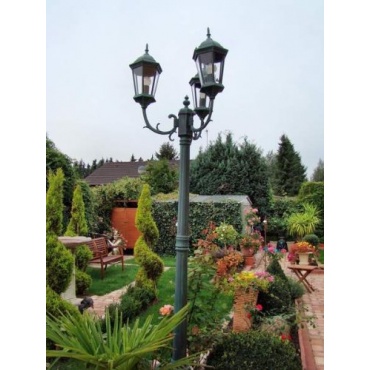 Die Außenleuchte von Urte Neumann soll mit ihrem Look den romantischen Gaslaternen ähneln, wie man sie aus dem 19. Jahrhundert kennt. Sie ist in einem dunklen Grün gehalten und verzweigt sich in drei Arme mit je einer Leuchte. Diese sind umrundet von Gläsern im Facettenschliff, die ein schönes, angenehmes Licht für den Garten und Außenbereich spenden. So sorgt die Lampe nicht nur für Helligkeit, sondern auch im Hellen für einen stilvollen Garten.