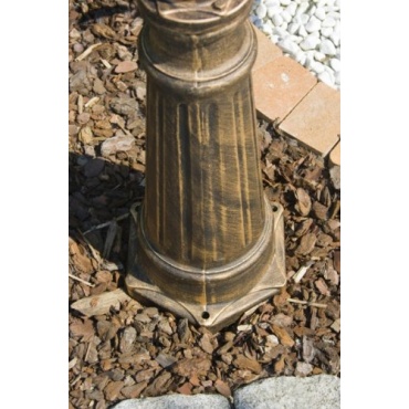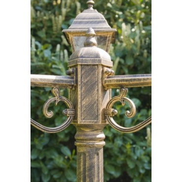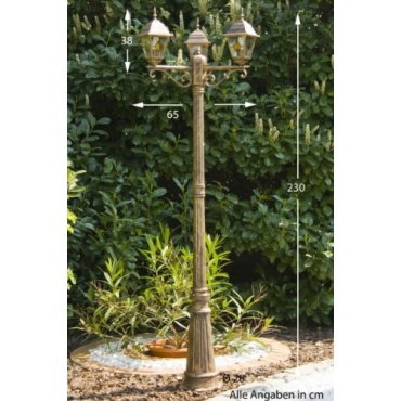 Mit der Kandelaber Außenlaterne hat man eine besondere Auswahl getroffen, denn sie ist aus Glas und Aluminium in edlem Design gebaut. Drei goldene Laternen strahlen rundum auf 202 cm Höhe und geben so neben einem flächendeckenden, warmen Licht auch einen ausgezeichneten Blickfang ab. Verzierte Gläser und ein goldener Sockel machen diese Außenbeleuchtung zu etwas besonderem. In die Fassung passen drei exklusive Leuchtmittel bis zu 60 Watt, so dass das Licht sehr einfach auf die gewünschte Helligkeit gebracht werden kann.