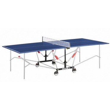 Aus Rundrohr und einer beschichteten Spanplatte besteht die Tischtennisplatte Sie ist mit einem festen Netz und vier Rädern ausgestattet. Die Räder sind hierbei schwenkbar. Die Tischtennisplatte erfüllt bei den Abmessungen die internationalen Anforderungen an das Turniermaß. So weisen die Abmessungen 274 x 152,5 x 76 cm auf. Sie kommt auf ein Gewicht von 60 kg. Farblich ist die Tischtennisplatte in einem blauen Design gehalten, das Untergestell in silber.