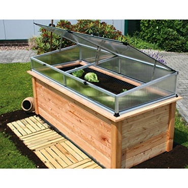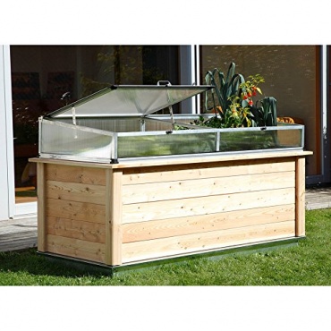 Die leicht milchigen Kunststoffscheiben sind aus robustem Polycarbonat gefertigt und halten Sonne, Wind und Wasser sowie Kälte von den Jungpflanzen effektiv ab. Die beiden Öffnungsklappen lassen sich zum Belüften, Bewässern und für die ersten Sonnenstrahlen mit zwei Handaufstellern fixieren. Der Hochbeet Aufsatz Woody ist 206 cm breit, 91 cm tief und 31 cm hoch. Die Arbeitshöhe beträgt 79 cm und insgesamt bietet das Frühbeet eine Nutz- bzw Anbaufläche von 2,12qm.