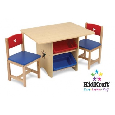 - sehr schönes Design in naturfarbenem Holz mit roten und blauen Akzenten, Sterne in den Stuhllehnen und in Tischbeine eingelassen, Tisch mit Ablagefächern unten drunter sehr praktisch, ideal für das Kinderzimmer oder eine Spielecke in einem anderen Raum geeignet, kann leicht zusammengebaut werden