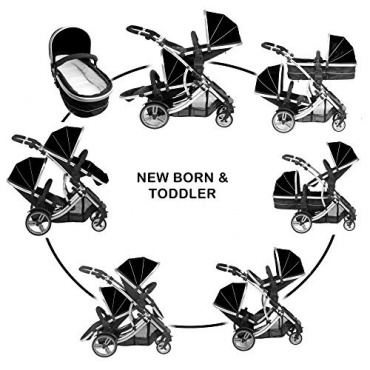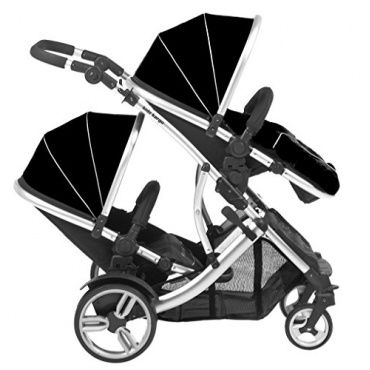 - Der schwarzblaue und pinke KidzKargo Zwillingskinderwagen kann auf beiden Ebenen mit Kidz Kargo Autositzen bestückt werden. Ein Regenschutz und gefütterte Fußsäcke sind ebenfalls vorhanden.