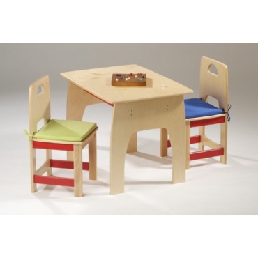 Diese Kindersitzgruppe von Plaho ist in einem hellen Holz gestaltet und mit roten Querverstrebungen an den Stühlen versehen. Das Design ist sehr kindgerecht. An dieser Sitzgruppe können Kinder nach Lust und Laune spielen und basteln. Die Sitzgruppe ist ideal für das Kinder- oder Spielzimmer. Der Vorteil dieser speziell auf Kinder zugeschnittenen Sitzgruppe ist, dass die Kleinen hier sicher und ihrer Größe entsprechend an einem Tisch sitzen können.