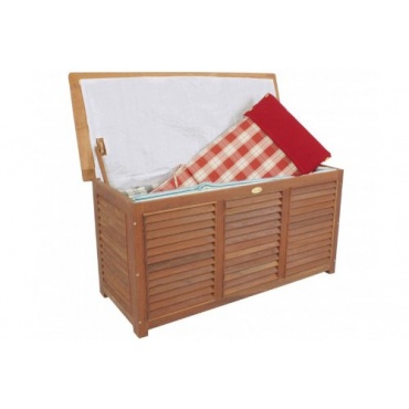 Diese Kissenbox ist extra für den Außenbereich ausgelegt und eine sinnvolle Anschaffung, um Sissenauflagen und Polster für den Garten oder die Terasse aufzubewahren. Innen misst die Box etwa 115 cm x 44 cm x 52 cm. Für eine längere Lebensdauer der Aufbewahrungsmöglichkeit, wurde das Eukalyptus zusätzlich eingeölt. Das Material ist absolut wetterfest.