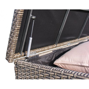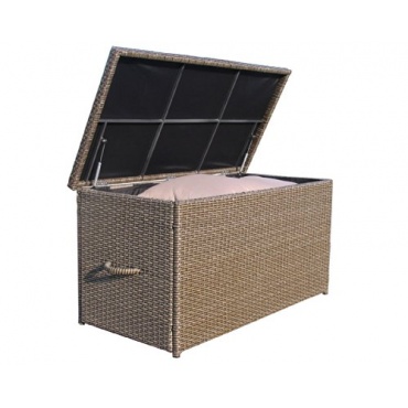 Diese XXL Kissenbox der Firma Grasekamp hat eine Maße von 133 x 65 cm. Die Höhe der Box beträgt ca. 70 cm.Die Box ist aus dem Kunststoff Rattan geflechtet, welcher wasserfest ist. Der Innenbezug ist ebenfalls wasserabweisend.Die Farbe der Box ist braun.Diese Kissenbox hat außerdem einen Aluminiumrahmen sowie einen Polyester Einsatz, der dem Regenschutz dient.Das Produkt hat ein Raumvolumen von 480 Litern.