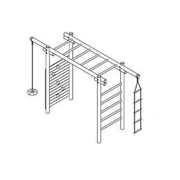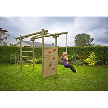 Das Klettergerüst besteht aus Rundhölzern und hat eine Länge von 360 Zentimeter, eine Tiefe von 120 cm, und eine Höhe von 230 Zentimeter. Die Kletterwand ist mit Klettergriffen ausgestattet. Die Leiter, sowie die Strickleiter und die Tellerschaukel geben dem Nachwuchs die Möglichkeit sich auszutoben. Die zwei Schaukelbalken sind 300 Zentimeter lang und haben einen Durchmesser von zehn Zentimeter.