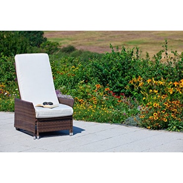 Mit dem Komfort Deckchair Sorrento bringt man mediterrane Eleganz auf die Terrasse. Das stabile Stahlgestell der Liege ist von einem Geflecht aus Kunststoff umgeben, dass die Liege wetterbeständig und langlebig macht. Der satte Braunton des Geflechts steht in einem attraktiven Kontrast zu dem hellen Creme Ton der Auflage und trägt weiterhin zum eleganten Auftritt des Deckchairs bei. Der Sorrento Deckchair ist eine Zierde für Garten und Terrasse.