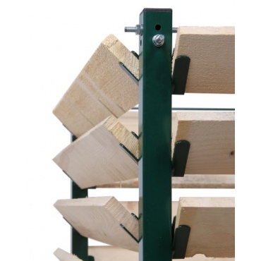 Der Komposter zeichnet sich durch ein neuartiges Stecksystem aus. Die Bretter werden schräg zwischen den Stahleckstützen eingesteckt. Anschließend werden die mitgelieferten Stahldrähte zwischen den Stahlpfosten verspannt. Die Stützfunktion für die Bretter entfällt. Sie können an beliebiger Stelle entnommen werden. Kletterpflanzen vor dem Kompost finden an den schrägen Oberflächen eine Rankhilfe. Die Metalleckpfosten und die Spannseile können nach dem Ausleeren des Komposters erneut verwendet werden.