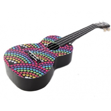 Die Korala Explore Rainbow Heart Konzert Ukulele ist besonders für Kinder und Jugendliche ein solides Einstiegsinstrument. Schließlich besitzt diese Ukulele ein tolles Design. Sie ist in der klassischen Konzert-Form gefertigt und komplett in Schwarz gehalten. Auf der Oberseite befinden sich bunte kleine Herzen, die einen tollen Kontrast zum Schwarz setzen. Das Preis-Leistungs-Verhältnis ist angemessen für eine Ukulele dieser Qualität.