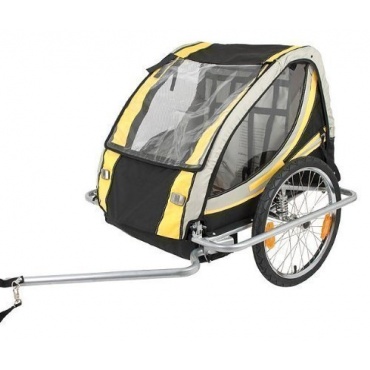 Aus Stahlrohr und Polyester gefertigt ist der Kinderanhänger. Der Kinderanhänger ist mit zwei 20 Zoll luftbereifteN Speichenrädern ausgestattet. Die Reifen beim Kinderanhänger sind mit Stoßdämpfer und einem Überrollbügel versehen. Platz bietet der Kinderanhänger für bis zu zwei Kinder. Im Kinderanhänger können die Kinder mit Fünfpunkt Sicherheitsgurten gesichert werden. Der Kinderanhänger ist mit einer Universalkupplung ausgestattet. Der Kinderanhänger ist auch mit Stauraum versehen, so gibt es einen Fußraum. Der Überzug aus Polyester beim Kinderanhänger ist sehr pflegeleicht. Beim Design ist der Kinderanhänger in einem schwarz/ gelben Farbton gehalten. Zum Kinderanhänger wird auch ein Sicherheitswimpel geliefert. Die Abmessungen vom Kinderanhänger betragen in der Länge 84 cm, in der breite 89 cm und in der Höhe 88 cm.