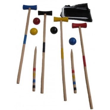 Das Krocket Set für die Familie besteht aus vier Holzschläger, die circa 57 Zentimeter lang sind, sowie aus vier farbige Holzkugeln mit einem Durchmesser von etwa fünf Zentimeter. Des Weiteren beinhaltet das Spieleset sechs Tore und zwei Pfosten, sowie eine Netztasche zur sicheren Aufbewahrung. Dank der verständlichen Spielanleitung ist das Spiel rasch erklärt. Im Freien mit der Familie Krocket spielen macht viel Freude.