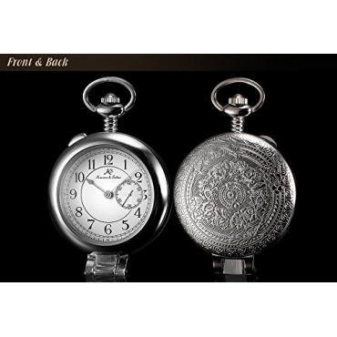 Die exklusive Taschenuhr besitzt ein präzises japanisches Quarzuhrwerk. Die nostalgische kleine Sekundenanzeige wird schnell zum zusätzlichen Highlight, welches die silberne Uhr unverwechselbar macht. Klassische Elemente wurden bei diesem Modell mit einem modernen Uhrwerk auf einzigartige Weise kombiniert. Die schöne Taschenuhr eignet sich hervorragend als Präsent für eine Frau jeden Alters. Lassen Sie sich einfach von der Schönheit der Uhr im nostalgischen Design verführen.