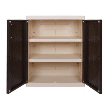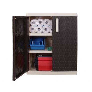 Der Kunststoffschrank Rattan XL überzeugt nicht nur mit edlem Design. Das beigefarbene Korpus tritt neben den dunkelbraunen Türen in Rattan-Optik geschickt in den Hintergrund. Der Beistellschrank ist aus hochwertigem, witterungsbeständigem, UV-beständigem und pflegeleichtem Kunststoff gefertigt und mit zwei ebensolchen Einlegeböden bedacht. Die Einlegeböden sind bis zu einem Gewicht von 25 kg belastbar. Die Türen lassen sich bis zu 180 Grad öffnen. Mit den Maßen von 90 x 54 x 95 cm bietet der Schrank Platz für Geräte, Gegenstände und Inventar Ihrer Wahl. Die geschlossene Bodenwanne schützt das Innere vor Nässe und Schimmelbildung. Das einzige Manko, mit 15 kg Gesamtgewicht ist der Schrank leicht und daher windgeschützt aufzustellen. Bei voller Beladung besteht jedoch keine Kippgefahr.