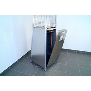 Der Heizstrahler besteht aus Aluminium, rostfreiem Edelstahl und Glas. Er hat eine Höhe von 223 Zentimeter und wird mit Flüssiggas betrieben. Die Wärmezufuhr kann man stufenlos regulieren und um den Heizstrahler an einen anderen Ort zu bringen, besitzt er noch zwei fest montierte Räder. Um ihn in Betrieb zu nehmen, braucht man Flüssiggas bis 11 Kilo, die man im Stauraum unterbringen kann. Er hat zudem einen Schutz das er nicht umkippen kann.