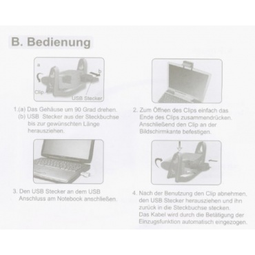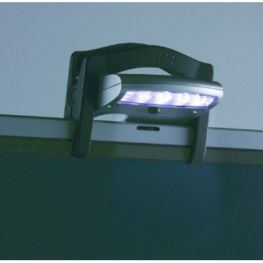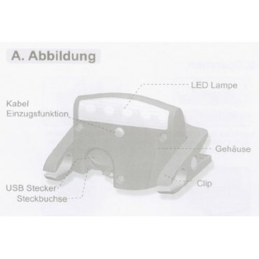 Die stabile, klappbare Klemmleuchte besteht aus ASB-Kunststoff. Fünf langlebige LED's ermöglichen eine gute und effiziente Beleuchtung mit angenehm empfundenem, warmen Licht. Nicht nur die Tastatur, sondern der komplette Arbeitsplatz werden ins rechte Licht gerückt. Das Gehäuse ist drehbar, stufenlos verstellbar und wird per Clip an der Bildschirmkante befestigt. Da die Klemmvorrichtung gummiert ist, werden Kratzer vermieden. Bei Nichtbenutzung findet der USB-Stecker Halt in einer geschützten Buchse, das 50 cm Anschlusskabel kann über automatischen Einzug verstaut werden.
