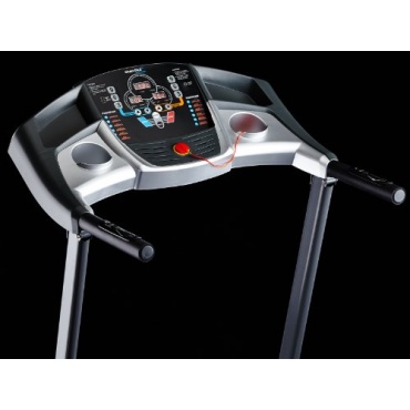 Das Laufband wird komplett montiert geliefert, lediglich einige Schrauben müssen festgezogen werden. Auf dem übersichtlichen Display können die verschiedenen Werte kontrolliert werden. Wer während des Trainings nicht auf Musik verzichten möchte, kann diese über die eingebauten Lautsprecher hören. Praktisch sind auch der Flaschenhalter und das iPad Rack, auf dem ein Tablett gelagert werden kann.