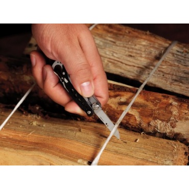 Die Schere, die über ungewöhnlich große Maße für ein Multifunktionstool verfügt, wird mittels Federmechanismus bedient. Das Messer aus 420 HC Stahl und weist eine gute Schärfe auf.