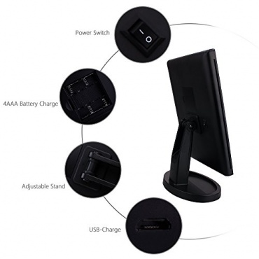 Der Clou des schwarzen Schminkspiegels sind die 21 LEDs, die auf der großen Spiegelfläche angebracht sind. Sie lassen sich per Touch-Sensor ein- und ausschalten, sowie in ihrer Leuchtintensität steuern. Sie reichen jedoch nicht, um bei wirklich schlechten Lichtverhältnissen für eine ausreichende Beleuchtung zu sorgen. Während die große Spiegelfläche und eine Seitenfläche das Gesicht 1:1 abbildet, ist der zweite seitliche Spiegel unterteilt. Er vergrößert zwei- beziehungsweise dreifach. Die Beleuchtung erfolgt entweder über USB-Kabel oder AAA-Batterien.