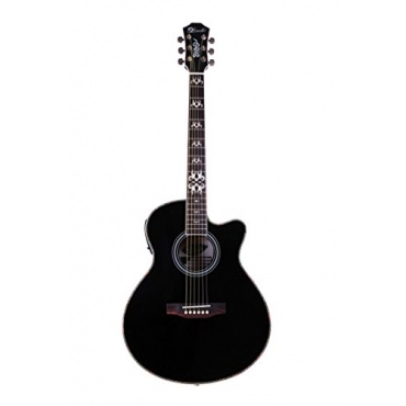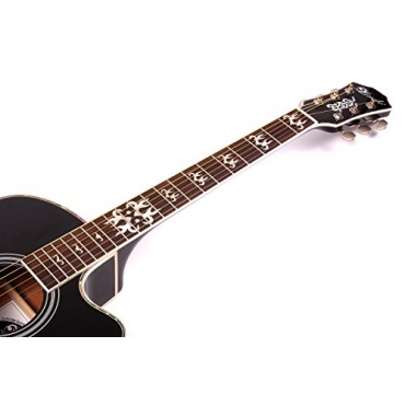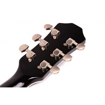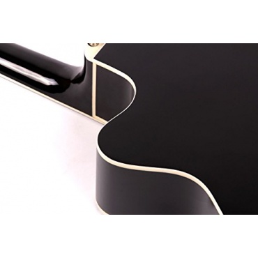 Die Elektro-Akustik Gitarre von Lindo ist in komplett schwarzem Design gehalten. Verzierungen auf dem Griffbrett und um die Wirbel herum heben sie optisch hervor. Der Vollkorpus besteht aus Fichtenholz, wodurch ein schöner rassiger Klang entsteht. Die Rückseite ist mit Lindenholz und das Griffbrett aus Palisander gefertigt. Für das einfache Stimmen der Stahlseiten ist ein Digitalstimmgerät in den Tonabnehmer mit 4-Band-Klangregelung integriert. Zur Abnahme kann wahlweise ein Standard Gitarrenkabel (6,3mm Klinke) oder ein XLR-Anschluss verwendet werden.