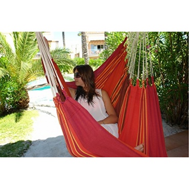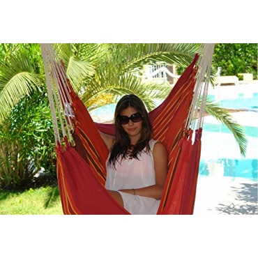 Der Hängesessel "Lola" in der angenehmen Farbe Terracotta lädt mit seiner großen Tuchfläche von 160x130cm zum Träumen und Entspannen ein. Das Tuch selber besteht zu 100% aus Baumwolle. Der Hängesessel ist bis 150 kg belastbar und besitzt eine Gesamthöhe von 165 cm, dadurch beträgt die Mindestaufhängehöhe 215 cm. Der Hängesessel "Lola" lässt sich sowohl innen als auch außen anbringen und ist ein toller Blickfang in jedem Ambiente. Mit einem Gesamtgewicht von 2,6 kg ist er noch dazu verhältnismäßig leichter als andere vergleichbare Modelle.