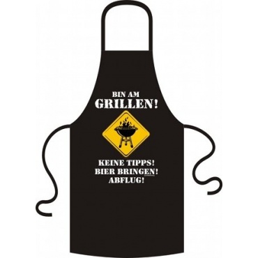 Eine Grillschürze mit einem lustigen Aufdruck ist ein Muss für echte Grillfreunde. Eine schwarze Grillschürze mit lustigem Spruch bietet Rahmenlos an. Der Aufdruck in weißer Schrift lautet: "Bin am Grillen! Keine Tipps! Bier bringen! Abflug!". Außerdem ist ein gelbes Warnschild mit einem Grill auf die Schürze gedruckt. Die Grillschürze besteht zu 100% aus Baumwolle und ist sehr strapazierfähig.