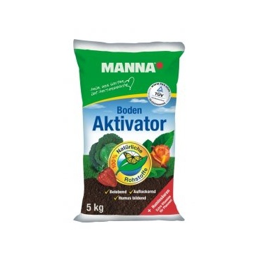 Der Manna Bodenaktivator wird im fünf Kilogramm Sack aus Kunststoff geliefert. Der Bodenhilfsstoff fördert die Humusbildung und verbesert den Boden mit Bestandteilen aus organischer und natürlicher Herkunft. Der Aktivator macht die Erde nährstoffreich und erleichtert den Pflanzen die Nährstoffaufnahme.
