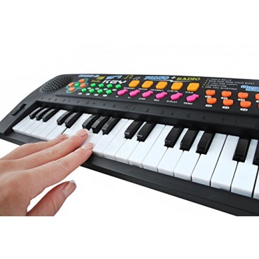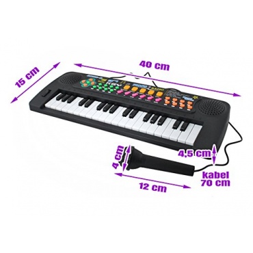 Musikalische Fähigkeiten und Gefühl für den Rhythmus zu entwickeln werden von dem Keyboard 37 Tasten Piano optimal unterstützt. Fünf Demo-Songs hat das Musikinstrument bereits parat, darüber hinaus können eigenen Songs kreiert und aufgenommen werden. Zur Verfügung stehen dabei 37 Tasten sowie acht verschiedene Musikinstrumente. Das Tempo ist regulierbar, die Lautstärke selbstverständlich auch. Ist das Gerät über einen gewissen Zeitraum nicht in Betrieb schaltet es sich automatisch ab, betrieben wird es mit 4 x AA Batterien (Achtung: nicht im Lieferumfang enthalten). Integriert ist auch ein FM-Radio 87,5-108,5 Mhz.